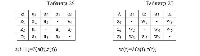 Способы задания автоматов Закон функционирования автоматов может быть задан в виде систем уравнений, таблиц, матриц и графов. Под законом функционирования понимается совокупность правил, описывающих переходы автомата в новое состояние и формирование выходных символов в соответствии с последовательностью входных символов. В зависимости от типа автомата при табличном задании закона функционирования автомата используются либо таблицы переходов и выходов (автомат Мили), либо совмещенная таблица переходов и выходов (автомат Мура). С помощью табл. 26 и 27 (таблицы переходов и таблицы выходов соответственно) задан закон функционирования абстрактного автомата Мили, для которого A={a1,a2,a3,a4}, Z={z1,z2,z3}, W={w1,w2,w3,w4,w5}.