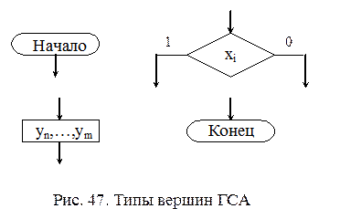 Граф-схема алгоритма Для записи микропрограмм в компактной форме используются специализированные языки. Одним из способов графического представления микропрограммы является граф-схема алгоритма (ГСА). ГСА представляет собой ориентированный связный граф. ГСА может содержать вершины четырех типов: начальную, операторную, условную и конечную (рис. 47). ГСА должна удовлетворять следующим основным требованиям: - в ГСА имеются одна начальная и одна конечная вершины; - входы и выходы вершин соединяются с помощью дуг; - каждая вершина должна лежать на одном из путей следования из начальной вершины в конечную; - один из выходов условной вершины может соединяться с ее входом; - в каждой условной вершине записывается одно из логических условий xi (допускается запись одинаковых условий в различных вершинах); - в каждой операторной вершине записывается микрокоманда (допускается пустая микрокроманда и повтор микрокоманды в различных вершинах).