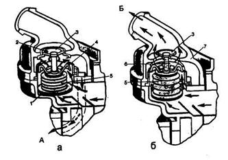 а - устройство; б - привод; 1 - корпус; 2 — крыльчатка; 3 - валик; 4 - пружина; 5 — уплотнительное устройство; о — верхний патрубок; 7 - масленка; 8 — шкив; 9 — крестовина; 10 — лопасть вентилятора; 11 -генератор; 12-ремень Последняя привернута к шкиву 8, который приводится в движение от коленчатого вала через ременную передачу. Шкив шпонкой и гайкой жестко закреплен на валике, который свободно вращается в корпусе 1 водяного насоса на шариковых подшипниках. С другой стороны на валике 3 жестко посажена крыльчатка 2 водяного насоса, которая представляет собой диск с равномерно расположенными на нем криволинейными лопатками, направляющими воду в водяную рубашку двигателя. Водяной насос закреплен на передней стенке блока цилиндров. Между корпусом насоса и блоком установлена паронитовая прокладка. Корпус насоса имеет два патрубка: боковой соединяет полость крыльчатки водяного насоса с нижним патрубком радиатора, а верхний 6 - с корпусом термостата. Термостат (рис. 41, а и б) необходим для автоматического регулирования температуры воды. Он изготовлен из латуни. К днищу корпуса 1 термостата припаян сильфон 5, несущий на себе вспомогательный клапан 4 и полый шток 6 с основным клапаном 3. Сильфон термостата, изготовленный в виде цилиндрической гармошки из тонкой латуни, заполнен легко кипящей жидкостью - смесью воды и этилового спирта.
