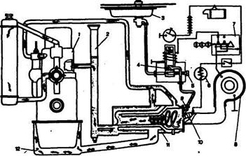 Рис 42. Пусковой жидкостной подогреватель: 1 - двигатель; 2 - заливная горловина подогревателя; 3 - топливный бак; 4 - электромагнитный клапан; 5 - Регулировочная игла; 6 - контрольная спираль; 7 - переключатель; 8 - электровентилятор; 9 - штуцер для присоединения топливоподводящей трубки; 10 - свеча накаливания; 11 - котел; 12 - кожух поддона Пусковой подогреватель обеспечивает надежный пуск двигателя в течение 20 минут. Контрольные вопросы 1. Перечислите основные части системы жидкостного охлаждениядвигателя. 2. Какого назначение термостата? 3. Для какой цели в крышке заливной горловины радиатора смонтирован паровоздушный клапан? 4. Расскажите об устройстве и схеме действия предпускового подогревателя.