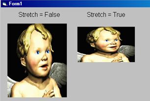 Рис. 8.1. Установка свойства Stretch элемента ImageBox. Элемент PictureBox Если значение свойства AutoSize элемента установлено равным True, размеры элемента изменяются в соответствии с размерами вставленного в него изображения. Если же значение свойства AutoSize – False, отбражается только та часть изображения, которая помещается в элемент. Для загрузки изображения в элемент во время выполнения приложения используется метод LoadPicture: Form1.Picture = LoadPicture («имя файла») Перечислим возможные расширения этого имени: BMP – растровый рисунок; GIF – формат обмена графическими данными; JPG – объединенная экспертная группа по фотографии; DIB – аппаратно-независимый растровый рисунок; WMF – метафайл Windows; EMF – усовершенствованный матафайл; ICO – значок. Если использовать метод LoadPicture без аргументов, то текущее изображение будет выгружено из элемента вместе с остальными рисунками и текстом, введенными в элемент или форму командами Circle, Line, PSet или Print. Picture1.Picture = LoadPicture() При обработке изображения во время работы приложения его сохраняют с помощью оператора SavePicture. Синтаксис этого оператора: SavePicture Picture, «имя файла» Следующий оператор сохраняет в файле содержимое элемента Picture1: SavePicture Picture, «c:\tmpImage.bmp»