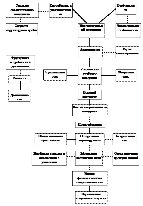 Рис.20. Корреляционная плеяда взаимосвязей признаков 9а класса Примечание к рисунку 20: сплошной линией обозначены положительные, пунктирной линией — отрицательные корреляционные зависимости. Таким образом, корреляционная плеяда [8](ρF-группа[9])— этоориентированный граф, вершинами которого служат психологические переменные, рёбрами – парные корреляции между ними, а ориентация любой пары вершин задаётся знаком, весом и направлением корреляции между ними. Если корреляционную плеяду построить по методу выделения максимальных взаимосвязей между признаками (методу максимального корреляционного пути), то она является, как это было показано Б. Докторовым[10], графическим аналогом центроидного метода в классическом факторном анализе, основанным на применении теории графов к анализу корреляционной матрицы. Рассмотрим данный алгоритм[11].