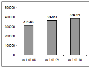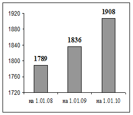 В 2008 г. сеть торговых предприятий увеличилась на 47 объектов и составила на 01.01.2009 год - 1836 объектов. Из 47 вновь открывшихся объектов – 18 продовольственных магазинов, 27 – непродовольственных (из них четыре – специализированных) и 2 - смешанных. Торговые площади в целом увеличились на 53 050 м2 или на 16,9%. На 01.01.2009г в городе 366 833 м2 торговых площадей. Сеть предприятий торговли за 2009 год увеличилась на 72 объекта или на 3,9% и составила на 01.01.2010 года - 1908 объектов, за 2008 год сеть предприятий торговли увеличилась на 47 объектов и составила на 01.01.2009 год - 1836 объектов (рис. 9). Из 72 вновь открывшихся объектов – 34 продовольственных магазина, 36 – непродовольственных (из них 6 – специализированных), 2 – смешанных. Торговые площади в целом увеличились на 21936 м2 или на 5,9 % и на 01.01.2010г. составили 388769 м2 торговых площадей (рис.10). В связи с открытием новых объектов предоставлено 524 рабочих места. Приведённые факты, безусловно, являются показателем стабильности и улучшения финансового положения населения.