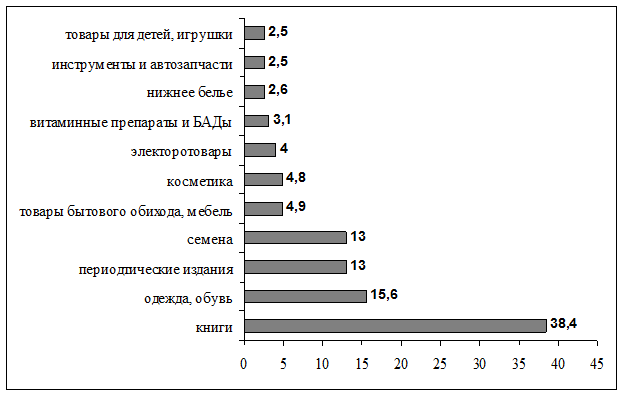 Рис. 41 Примерная структура товарооборота реализации товаров посредством почтовой торговли, % (в РФ)
