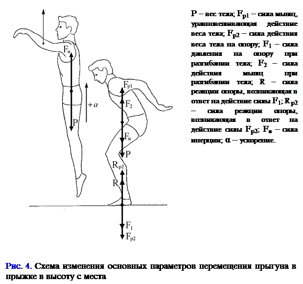 где S – длина и Н – высота траектории ОЦМТ (без учета его высоты в момент вылета и приземления), ν – начальная скорость ОЦМТ в полете, α – угол вектора скорости к горизонтали в момент вылета, g – ускорение свободно падающего тела, h – высота ОЦМТ в конце отталкивания. Каждый прыжок условно (для удобства анализа) делится на четыре части: разбег, отталкивание, полет и приземление. Каждая из них имеет соответствующее значение для достижения спортивного результата. Самой важной для прыжков частью двигательного действия является отталкивание. Механизм отталкивания легче всего рассмотреть на модели отталкивания при прыжке в высоту с места (рис. 4). Оттолкнуться при выпрямленных суставах тела невозможно. Прежде надо согнуть ноги и наклонить туловище. Это и есть подготовка к отталкиванию. Из согнутого положения тела и происходит отталкивание, т.е. распрямление ног и туловища. В этом случае во время выпрямления звеньев тела прыгуна действуют две силы, равные по величине и направленные в противоположные стороны. Одна из них направлена вниз и приложена к опоре, другая приложена к телу прыгуна и направлена вверх. Кроме того, на опору действует и сила тяжести (вес тела). Силы, воздействующие на опору, вызывают реакцию опоры. Однако реакция опоры не является движущей силой, она лишь уравновешивает силы, воздействующие на опору. Другая сила, направленная вверх, приложена к подвижным звеньям. Это сила напряжения мышц.
