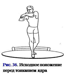 Перед скачком метатель становится у задней по направлению толкания части круга. Скачок выполняется из положения стоя спиной к направлению толкания (рис. 37). Правая нога ставится вплотную к обручу, ограничивающему круг, левая – отставляется на носок или ставится рядом. Тяжесть тела сосредоточена на правой ноге, туловище выпрямлено, взгляд направлен в сторону, противоположную толканию, левая рука перед собой.