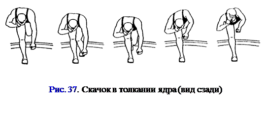 Скачок (рис. 38) начинается с маха левой ноги назад и несколько вниз к месту постановки левой ноги в упор. Одновременно метатель выпрямляет правую ногу в коленном суставе, стараясь при этом, чтобы ОЦМТ не поднимался вверх, а двигался вперед по направлению толкания ядра и даже несколько вниз. За счет маха левой ноги происходит выведение ОЦМТ за пределы опоры правой ноги, которая производит отталкивание вслед движению ОЦМТ. Отталкивание может выполняться с пятки или с носка. В последнем случае в отталкивании активное участие будут принимать мышцы голеностопного сустава. После отрыва носка правой ноги от поверхности круга голень быстрым движением подтягивается под тазобедренный сустав правой ноги, колено поворачивается немного вовнутрь, стопа ставится на носок. Быстрое и возможно полное подтягивание голени – важное условие для своевременного начала финального усилия и лучшего использования силы мышц ног. После скачка необходимо сразу принять двухопорное положение (или чтобы промежуток времени между постановкой правой ноги и левой был почти не замечен). Корпус тела при этом должен сохранить первоначальное положение, т.е. спина должна смотреть по направлению толкания, плечи быть наклонены вперед к колену правой ноги, а левая рука – находиться внизу перед грудью. Кроме того, метатель не должен делать преждевременного поворота левого плеча в сторону толкания и выпрямлять правую ногу в коленном суставе. Правая нога после скачка ставится на носок, при этом сохраняется исходное направление ее стопы или она поворачивается слегка внутрь. Левая же нога, стопоря продвижение тела метателя вперед, ставится выпрямленной на всю стопу, которая слегка разворачивается наружу. С момента постановки левой ноги в упор или с момента двухопорного положения начинается финальное усилие.