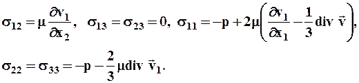 Например, при плоском слоистом течении жидкости вдоль оси Ох1, когда v1 = v1(x1, x2), v2 = v3 = 0, нормальные и касательные напряжения равны
