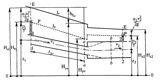 Отметим, что понятие напора было введено для тех сечений потока, где движение равномерное или плавноизменяющееся. На участке, где движение резкоизменяющееся (например, между сечениями а - а и b - b на рис. 7.5), напорная и пьезометрическая линии строятся условно путем их экстраполяции из областей, где движение плавноизменяющееся. На участке с равномерным движением (например, между сечениями 1 -1 и а - а) потери напора потока на каждую единицу длины будут одинаковы (структура потока во всех сечениях одинакова, следовательно, и работа всех внутренних сил, определяющих потерю напора, в одинаковых объемах будет одинакова), поэтому напорная линия Е - Е на таких участках будет прямой. Пьезометрическая линия, которая располагается всегда ниже напорной на величину Уклон напорной линии называется гидравлическим и обозначается Je, а уклон пьезометрической линии называется пьезометрическим и обозначается Jp. Например, для участка потока между сечениями 1 - 1 и а - а