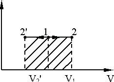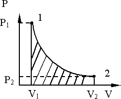 Рис. 9.7. Работа в изотермическом процессе изображается заштрихованной площадью под гиперболической кривой 1 – 2.