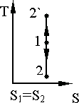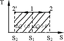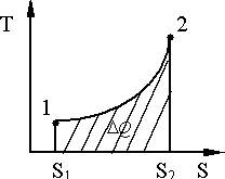 Рис. 9.8. Рис. 9.9. На T,S диаграмме вдоль оси ординат откладывается абсолютная температура Т, а вдоль оси абсцисс - энтропия S. Изотермический процесс на T, S диаграмме изображается прямой, параллельной оси абсцисс. Расширение соответствует линии 1 – 2, Адиабатный процесс на диаграмме T,S изображается вертикальной линией 1 – 2 (расширение) или 1 - Произвольный обратимый процесс изображается, например, линией 1 – 2 (рис. 9.10). Площадь под кривой 1 – 2 изображает количество теплоты:
