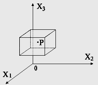 Поскольку при растяжении (e > 0) объем никогда не уменьшается, то Понятие о тензоре деформации. В рассмотренных выше случаях мы имели дело с одномерными однородными деформациями растяжения и сдвига (вдоль одного направления), где e и g оказывались одними и теми же для всех элементарных объемов резинового шнура. Во многих случаях ситуация гораздо сложнее: с одной стороны, деформации меняются от точки к точке (неоднородные деформации), а с другой стороны, не являются одномерными. Последнее означает, что деформации в некоторой точке P описываются тремя деформациями растяжения e11,e22,e33 маленького кубика с т. P внутри (рис. 4.6) и двумя сдвигами каждой из трех граней кубика: g12,g13;g21,g23;g31,g32. Здесь первый индекс i означает, что грань кубика перпендикулярна оси Xi, второй индекс j означает, что грань смещается вдоль оси Xj. Таким образом, неоднородные деформации в каждой точке тела в общем случае характеризуются набором 9 величин деформаций, являющихся функциями координат. Эти девять величин составляют тензор деформаций, но независимы лишь 6 его величин. Рассмотрим несколько подробнее подход, используемый для описания деформации в некоторой точке P, приводящий к введению понятия тензор деформаций. Пусть тело находится в недеформированном состоянии, и известно положение каждой из его частиц, задаваемых радиус-вектором r относительно некоторой системы координат как, например, положение т.P на рис 4.7. При деформировании все его точки, вообще говоря, смещаются. Смещение каждой точки можно охарактеризовать вектором смещения u(x1, x2, x3), являющегося при неоднородных деформациях функцией координат. Деформации в точке будут определены лишь тогда, когда будет известно смещение соседних с т. P частиц тела. Таким образом, задание смещения всех частиц тела полностью определяет его деформацию. В самом деле, рассмотрим две бесконечно близкие точки P(x1,x2,x3) и P'(x1+dx1,x2+ dx2,x3+dx3), имеющие смещения u (x1,x2,x3) и u' = u (x1+dx1,x2+dx2,x3+dx3). Из рисунка нетрудно видеть, что если взаимное расположение точек в недеформированном состоянии задавалось радиус-вектором
