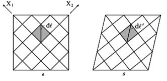 (4.3.12) В качестве примера рассмотрим деформацию сдвига в резиновом кубе, изображенном на рис. 4.5. Для удобства нанесем на его боковую грань прямоугольную сетку, разбивающую эту грань на маленькие квадратики со сторонами, параллельными ее диагоналям (рис.4.8,а). При деформации квадратики превращаются в прямоугольники (рис.4.8,б). Если под