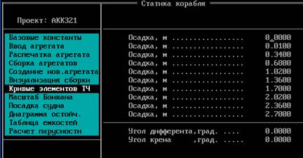 Данный режим предназначен для расчета кривых элементов теоретического чертежа (ТЧ), стандартно принятых при расчетах статики корабля. При этом при использовании в расчетах диаметрального батокса, длина действующей ватерлинии берется с агрегата, стоящего в списке сборки на первом месте. При указании маркером режима "Кривые элементов ТЧ" и нажатием клавиши ENTER на экране появляются дополнительно две таблицы - запросы: одна - по требуемым осадкам, а другая - по крену и дифференту (см. рис.19). При этом по умолчанию на месте исходных чисел стоят нули. Подводя маркер в нужное место, пользователь задает необходимую числовую информацию. Таблицы по осадкам и углам задействуются отдельно. По осадкам - клавиша PageUp, по углам - PageDown.
