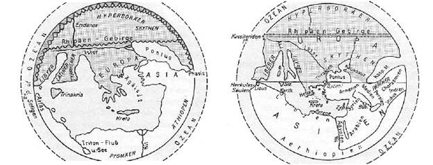 Im 5. und 4. Jh v.u.Z. wiesen die Pythagoreer erstmalig auf die Kugelgestalt der Erde hin, eine Auffassung, die von Aristoteles weiterentwickelt wurde. Eratosthenes stellte im 3. jh v.u.Z. bereits die ersten Berechnungen über die Größe der Erde an. Pytheas entdeckte auf seiner Seereise nach Norden nicht nur das Land der Mitternachtssonne «Thule», sondern berichtete auch von Gezeiten, Gletschern und Eisflächen. Durch die Kriegszüge des Alexander von Makedonien, der von Gelehrten begleitet wurde, gelangten erste Nachrichten über die Landschaften bis zum Syr-Darja in Mittelasien und bis zum Indus in Vorderindien nach Griechenland. Um 100 v.u.Z. wurde die Erscheinung der Monsune für den Bereich des Indischen Ozeans bekannt, die nun von Händlern der Mittelmeergebiete für ihre Fahrten bis Hinterindien genutzt wurden. Mit der Ausweitung des römischen Reiches im 3. und 2. Jh. v.u.Z. wurden weitere Teile Europas, Afrikas und Asiens entschleiert, so dass Ptolemäus (2.Jh. u.Z.) in der Lage war, in seinen berühmten Schriften ein relativ geschlossenes Bild der Erde des Altertums zu zeichnen.