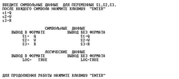 PROGRAM lab4; USES CRT; { ПОДКЛЮЧЕНИЕ МОДУЛЯ CRT } CONST LOG=TRUE; VAR K,M,N:INTEGER; X,Y:REAL; S1,S2,S3:CHAR; BEGIN CLRSCR; { ОЧИСТКА ЭКРАНА } WRITELN (' ВВЕДИТЕ ЦЕЛЫЕ ЧИСЛА K, M, N В ОДНУ СТРОКУ ЧЕРЕЗ ПРОБЕЛ.'); WRITELN (' ПОСЛЕ ПОСЛЕДНЕГО ЧИСЛА НАЖМИТЕ КЛАВИШУ "ENTER" '); READLN (K, M, N); WRITELN; WRITELN (' ':20,'ЦЕЛЫЕ ЧИСЛА'); WRITELN (' ':5,'ВЫВОД В ФОРМАТЕ',' ':10,'ВЫВОД БЕЗ ФОРМАТА'); WRITELN (' ':10,'K=',K:5,' ':20,'K=',K); WRITELN (' ':10,'M=',M:5,' ':20,'M=',M); WRITELN (' ':10,'N=',N:5,' ':20,'N=',N); WRITELN; WRITELN (' ВВЕДИТЕ ДЕЙСТВИТЕЛЬНЫЕ ЧИСЛА X, Y В ОДНУ СТРОКУ ЧЕРЕЗ ПРОБЕЛ.'); WRITELN (' ПОСЛЕ ПОСЛЕДНЕГО ЧИСЛА НАЖМИТЕ КЛАВИЩУ "ENTER" '); READLN (X,Y); WRITELN; WRITELN (' ':20,'ДЕЙСТВИТЕЛЬНЫЕ ЧИСЛА'); WRITELN (' ':5,'ВЫВОД В ФОРМАТЕ',' ':10,'ВЫВОД БЕЗ ФОРМАТА'); WRITELN (' ':10,'X=',X:8:4,' ':15,'X=',X); WRITELN (' ':10,'Y=',Y:8:4,' ':15,'Y=',Y); WRITELN; WRITELN (' ВВЕДИТЕ СИМВОЛЬНЫЕ ДАННЫЕ ДЛЯ ПЕРЕМЕННЫХ S1, S2, S3.'); WRITELN (' ПОСЛЕ КАЖДОГО СИМВОЛА НАЖМИТЕ КЛАВИШУ "ENTER" '); WRITE (' s1='); READLN(S1); WRITE (' s2='); READLN(S2); WRITE (' s3='); READLN(S3); WRITELN; WRITELN (' ':20,'СИМВОЛЬНЫЕ ДАННЫЕ'); WRITELN (' ':5,'ВЫВОД В ФОРМАТЕ',' ':10,'ВЫВОД БЕЗ ФОРМАТА'); WRITELN (' ':10,'S1=',S1:3,' ':20,'S1=',S1); WRITELN (' ':10,'S2=',S2:3,' ':20,'S2=',S2); WRITELN (' ':10,'S3=',S3:3,' ':20,'S3=',S3); WRITELN; WRITELN (' ':20,'ЛОГИЧЕСКИЕ ДАННЫЕ'); WRITELN (' ':5,'ВЫВОД В ФОРМАТЕ',' ':10,'ВЫВОД БЕЗ ФОРМАТА'); WRITELN (' ':10,'LOG=',LOG:7,' ':15,'LOG=',LOG); WRITELN; WRITELN; WRITELN; WRITELN (' ДЛЯ ПРОДОЛЖЕНИЯ РАБОТЫ НАЖМИТЕ КЛАВИШУ "ENTER" '); READLN; {ЗАДЕРЖКА ЭКРАНА ВЫПОЛНЕНИЯ ПРОГРАММЫ ДО НАЖАТИЯ КЛАВИШИ "ENTER"} END.