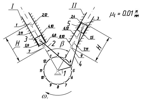 Рисунок 10 – Схема V-образного ДВС В качестве исходных данных при построении схемы механизма и обработке индикаторной диаграммы приняты: размеры звеньев механизма: r = lОА = 0,13 м; lAB = lАС = 0,43м; b = 60°. максимальное давление в цилиндрах двигателя – 6,0 МПа; диаметр цилиндров D = 0,1 м. За начальное (первое) положение механизма следует принимать такое, при котором поршень цилиндра I занимает крайнее верхнее положение и ось шатуна расположена на оси цилиндра. Исходя из деления окружности движения точки А кривошипа за цикл установившегося движения (за 1 оборот) на 12 равных интервалов, в положении 1 кривошипа поршень цилиндра II будет занимать положение 11. Разметка положений поршней приведена на схеме механизма. Индикаторные диаграммы для обоих цилиндров V-образного ДВС (рис. 11) одинаковы. Аналогично обработке индикаторной диаграммы четырехтактного ДВС выполняется согласование масштабов индикаторной диаграммы и плана механизма и на диаграмме наносят точки, соответствующие положениям механизма. Положения поршня цилиндра II на индикаторной диаграмме показаны через запятую.