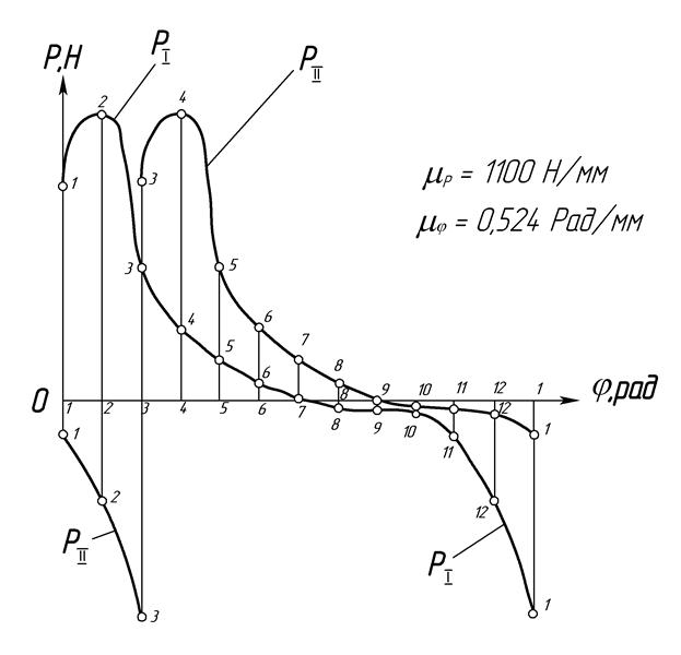 F – площадь поршней цилиндров, м2. По величине движущих сил строится расчетная нагрузочная диаграмма (рис. 12), на которой изображаются графики нагружения Для каждого положения механизма строятся рычаги Жуковского с нанесением на них в сходственных точках заданных сил