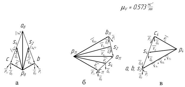 Рисунок 13 – Рычаги Жуковского для 8 (а), 11 (б) и 4 (в) положений механизма V-образного ДВС