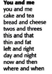 9. He sighed, she sighed They both sighed Sitting side by side On the river side. 10. If a woodchuck could chuck wood. How much wood would a woodchuck chuck if a woodchuck could chuck wood? 11. The smile of a snake She speaks slowly and smokes special expensive cigarettes. As she steps upstairs her long skirt sweeps over her silver slippers. She is slim and smart and sweet-smelling. Her skin is like snow. “You’ve stolen my heart” I said once stupidly And then she smiled, but when she smiled she smiled the smile of a snake. 12.