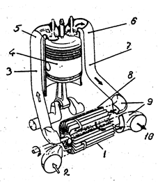 Рис. 3.31. Схема работы системы Comprex c дизелем. 1 – ротор, 2 – всасывание воздуха, 3 – впускной коллектор, 4 – поршень, 5 – впускной канал двигателя, 6 – выпускной канал двигателя, 7 – выпускной трубопровод, 8 – корпус компрессора, 9 – коллектор подвода и отвода газов, 10 – выпуск газов.