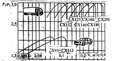 Системы СХ 93 и СХ 112 предназначены преимущественно для легковых автомобилей, хотя модернизацией СХ 112 можно перевести его в параметры, необходимые для тяжёлых грузовиков. Частота вращения наиболее лёгкого СХ 93 достигает 18000 об/мин, наиболее тяжёлого СХ 200 – 8500 об/мин, причём, последний обеспечивает мощности дизелей от 250 до 450 кВт. Уровень достижимой степени повышения давления достигает 3,0. Однако, возможно его повышение до 3,5, когда температура выпускных газов достигает 700 0С. Для легковых автомобилей степень повышения давления выше 2,10 применяется редко. В то же время, видно, что для применения в легковых автомобилях система “Компрекс” обеспечивает плавно изменяющееся давление наддува с изменением частоты вращения примерно в соотношении 1:4,5 (т. е. от 0,22 до 1,0 от номинала). На рис. 3.35 показана универсальная характеристика дизеля с системой “Компрекс”.