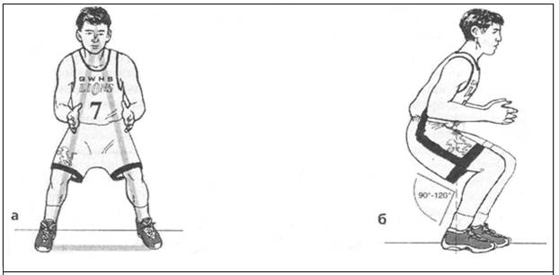 Посмотрите на рис. 3.4 б. Кисти и руки должны быть согнутыми и удерживаться близко к телу для сохранения равновесия и быстроты. Не забывайте о «низкой посадке» — угол в коленных суставах (с задней поверхности ног) должен быть в пределах 90°-120°, чтобы удерживать низко центр тяжести тела. Стойка для быстрого реагирования используется и в нападении, где ее часто называют «позицией тройной угрозы» (ТУ), поскольку мяч находится на основной стороне тела вблизи воронки, образуемой кистями рук (образуй воронку и укрой мяч), и когда игрок может быстро бросить мяч, сделать передачу или начать вести мяч. Игроки используют стойку для быстрого реагирования и в защите, сохраняя активность стоп, а руки — в готовности, согнутые в локтях.