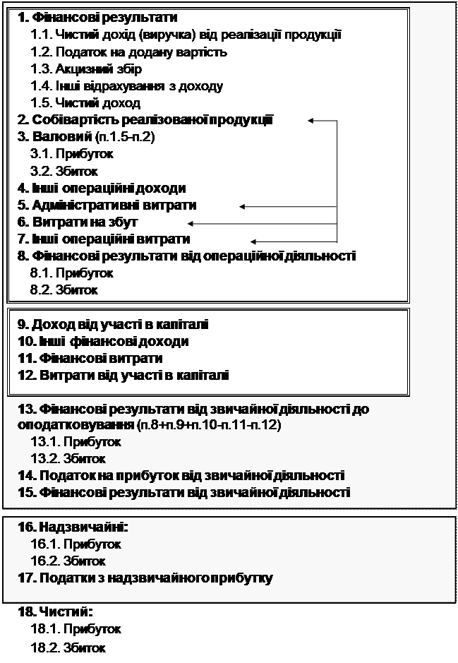 Рис. 8.3. Формування фінансового результату за видами економічної діяльності Слід зазначити, що собівартість реалізованої продукції визначається відповідно до економічного змісту цієї категорії і включає прямі матеріальні витрати, прямі витрати на оплату праці і виробничі накладні витрати. Адміністративні витрати за змістом відповідають загальнодержавним витратам. Витрати на збут відповідають комерційним витратам і включаються в невиробничі витрати виробничих підприємств і витрати обігу торгових підприємств. Фінансовий результат від операційної діяльності визначається як алгебраїчна сума валового прибутку (збитку), іншого операційного прибутку, адміністративних витрат, витрат на збут і інших операційних витрат. Прибуток (збиток) від звичайної діяльності до оподаткування визначається як алгебраїчна сума прибутку (збитку) від основної діяльності, фінансових та інших доходів (прибутків), фінансових і інших витрат (збитків). Сума податку на прибуток від звичайної діяльності розраховується на основі чинного податкового законодавства. Прибуток від звичайної діяльності визначається як різниця між прибутком від звичайної діяльності до оподаткування і сумою податку на прибуток. Збиток від звичайної діяльності дорівнює сумі збитку від звичайної діяльності до оподаткування плюс сума податку на прибуток. "Надзвичайні прибутки" і "Надзвичайні витрати" виділені з статті "Інші операційні прибутки і витрати". Коригування податку на прибуток у зв'язку з їх наявністю здійснюється шляхом відображення окремої статті "Податок з надзвичайного прибутку" або відніманням з суми збитків від надзвичайних подій суми, на яку зменшується податок на прибуток від звичайної діяльності внаслідок цих збитків. Чистий прибуток розраховується як алгебраїчна сума прибутку (збитку) від звичайної діяльності і надзвичайного прибутку, надзвичайного збитку і податку з надзвичайного прибутку. Розділ 2 "Елементи операційних витрат" "Звіту про фінансові результати" включають матеріальні витрати, витрати на оплату праці, відрахування на соціальні заходи, амортизацію та інші операційні витрати. Однак на відміну від раніше діючого порядку, якщо деталізації за елементами витрат підлягали тільки витрати на виробництво реалізованої продукції (робіт, послуг) або витрати обігу для торгових підприємств, то згідно П(С)БО-3 ця вимога торкається всіх операційних витрат (собівартості реалізованої продукції, адміністративних витрат, витрат на збут, інших операційних витрат). Розділ 3 "Розрахунок показників прибутковості акцій" торкається обмеженого кола підприємств. Інформація, яка тут відбивається, насамперед цікавить дійсних і потенційних акціонерів. Чистий прибуток, що припадає на одну просту акцію, визначається відношенням суми чистого прибутку або збитку, яка належить власникам простих акцій, на середньорічну кількість простих акцій. Якщо акціонерне товариство не випустило привілейованих акцій і, отже, не має зобов'язань по виплаті дивідендів за такими акціями, то тоді власникам простих акцій належить весь чистий прибуток (збиток), відображений у розділі І "Звіту про фінансові результати". В іншому випадку необхідно з суми чистого прибутку відняти (а до суми чистого збитку додати) дивіденди, оголошені або виплачені власникам привілейованих акцій. Д