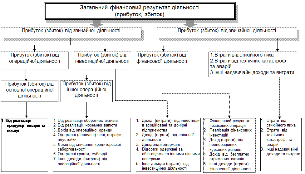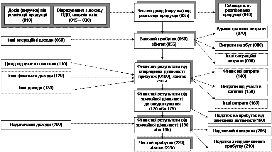 Рис. 8.2. Схема зв’язків між окремими сумами доходів, витрат і прибутків (збитків) підприємства,