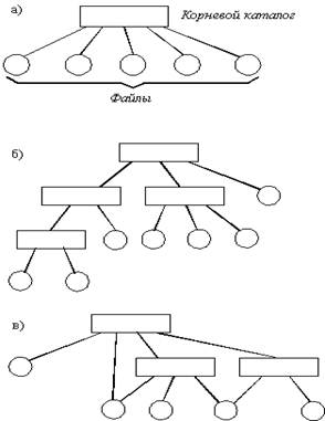 Рис. 2. Логическая организация файловой системы: а – одноуровневая; б – иерархическая (дерево); в – иерархическая (сеть).
