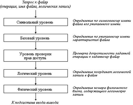 Функционирование любой ФС можно представить многоуровневой моделью (см. рис. 5), в которой каждый уровень предоставляет некоторый интерфейс (набор функций) вышележащему уровню, а сам, в свою очередь, для выполнения своей работы использует интерфейс (обращается с набором запросов) нижележащего уровня. Задачей символьного уровня является определение по символьному имени файла его уникального имени. В ФС, в которых каждый файл может иметь только одно символьное имя (например, MS-DOS), этот уровень отсутствует, так как символьное имя, присвоенное файлу пользователем, является одновременно уникальным и может быть использовано ОС. В других ФС, в которых один и тот же файл может иметь несколько символьных имен, на данном уровне просматривается цепочка каталогов для определения уникального имени файла. В ФС UNIX, например, уникальным именем является номер индексного дескриптора файла (i-node). На следующем, базовом уровне по уникальному имени файла определяются его характеристики: права доступа, адрес, размер и другие. Характеристики файла могут входить в состав каталога или храниться в отдельных таблицах. При открытии файла его характеристики перемещаются с диска в оперативную память, чтобы уменьшить среднее время доступа к файлу. В некоторых ФС (например, HPFS) при открытии файла вместе с его характеристиками в оперативную память перемещаются несколько первых блоков файла, содержащих данные.