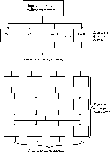 Разработчики ОС стремятся обеспечить пользователя возможностью работать сразу с несколькими ФС. В новом понимании файловая система состоит из многих составляющих, в число которых входят и ФС в традиционном понимании. Новая ФС имеет многоуровневую структуру (см. рис. 7), на верхнем уровне которой располагается так называемый переключатель ФС.