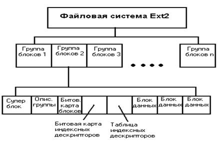 Современная, мощная и бесплатная ОС Linux предоставляет широкую территорию для разработки современных систем и пользовательского программного обеспечения. Некоторые из наиболее интересных разработок в ядрах Linux это новые, высоко производительные технологии для управления хранением, размещением и обновлением данных на диске. EXT 2 (The Second Extended File System). Ext2 – ФС, создаваемая в Linux по умолчанию. В результате ее создания раздел дискового накопителя будет состоять из множества областей, – групп блоков, которые, в свою очередь, подразделяются на меньшие области. На рис. 8 приведена схема ФС Linux.
