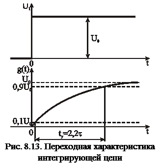 Чем выше частота среза, тем меньше время установления. Как видно из рис. 8.10, переходный процесс в идеальном ФНЧ носит колебательный характер. Интегрирующая RС цепочка может рассматриваться как линейный четырехполюсник (рис. 8.11). Комплексный коэффициент передачи определяется как