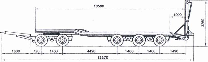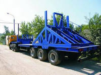 Рисунок 6.9 - Полуприцеп-платформа с откидывающейся аппарелью, грузоподъемностью 39 т, предназначенный для перевозки строительной техники Габаритно-массовые параметры прицепов-тяжеловозов первой группы незначительно отличается от обычных прицепов, поэтому для их транспортирования используются универсальные автомобили-тягачи. Вторую группу прицепов-тяжеловозов составляют АТС с увеличенными габаритно-массовыми размерами и осевыми нагрузками, а также большим числом осей и колес. Третья группа прицепов-тяжеловозов отличается особо большой грузоподъемностью и служит для перевозки сверхтяжелых грузов. Для второй и третьей групп требуется один или несколько специальных автомобилей-тягачей По составу автотранспортные средства -тяжеловозы бывают прицепнымии седельными. по назначению - универсальными и узкоспециализированными по условиям эксплуатации - для дорог общей сети и для внутрихозяйственных дорог. Основным конструктивным требованием, которое предъявляется к прицепам и полуприцепам-тяжеловозам, является их минимальная погрузочная высота, равная у прицепов 500-1200 мм, а у полуприцепов - 1200... 1400 мм. Это требование вызвано не столько габаритными ограничениями по высоте перевозимого груза, сколько необходимостью обеспечения достаточной устойчивости движения автопоезда с грузами, имеющими высоко расположенный центр тяжести. Кроме того, минимальная погрузочная высота облегчает погрузку и разгрузку тяжелых крупногабаритных грузов. Некоторые конструкции тяжеловозов для изменения высоты платформы (в определенных пределах) оборудуются механическими домкратами или гидравлическими подъемными механизмами, которые устанавливаются между платформой и тележками осей прицепов или полуприцепов. частности, у прицепа-тяжеловоза ЧМЗАП-5530 для погрузки тяжелого неделимого груза платформа может быть опущена при помощи гидросистемы в течение 2-5 мин. Погрузочная высота при опущенной платформе равна 500 мм, при поднятой платформе без нагрузки - 900 мм, под нагрузкой - 850 мм Большинство прицепов и полуприцепов-тяжеловозов имеют безбортовую грузовую платформу, которая при необходимости может быть дополнительно оборудована бортами. Прицепы-тяжеловозы достаточно часто выпускают с подкатными (отделяемыми) тележками что позволяет при необходимости превращать их в полуприцепы-тяжеловозы. Для размещения подкатной тележки в передней (если подкатных тележек две, то в передней и задней) части рамы делается выгиб, разность уровней между полками рамы составляет 350-550 мм. Подкатная тележка снабжается типовым опорно-сцепным устройством, а связь ее с прицепным звеном осуществляется шкворнем. Тележки, в зависимости от грузоподъемности, изготавливаются одно-, двух- или многоосными. Оси многоосных тележек могут быть поворотными и неповоротными, а также иметь управляемые колеса. Прицепы-тяжеловозы имеют, как правило, от 3 до 12 осей, а полуприцепы-тяжеловозы - от 2 до 3. Общее количество колес на этих осях у прицепов 12-96, а полуприцепов 8-12. Для изготовления рам прицепов и полуприцепов-тяжеловозов используется низколегированная сталь. Чаще всего рама - это связанные между поперечинами два внутренних и два наружных продольных лонжерона. Внутренние лонжероны обычно изготавливают из двутавровых балок, наружные — из швеллеров. К нижним полкам лонжер