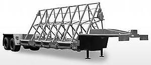 Автотранспортные средства для перевозки ферм Длиннобазовые полуприцепы-фермовозы предназначены для перевозки ферм длиной 12,18, 24 м, установленных и закрепленных в положении, близком к рабочему. Полуприцепы-фермовозы имеют низкорамную ферменно-кассетную конструкцию и опираются на управляемые одно- и двухосные поворотные тележки со сдвоенными колесами. Одноосными тележками оборудуются полуприцепы-фермовозы грузоподъемностью до 12 т, фермовозы большей грузоподъемности имеют двухосные тележки. Канатное или гидравлическое поворотное устройство тележек обеспечивает поворот их осей с колесами на соответствующий угол в зависимости от угла «складывания» автопоезда. Управляемые тележки позволяют эксплуатировать фермовозы в стесненных условиях строительных площадок. На рисунке 6.7 показан полуприцеп-фермовоз ПФ2224 грузоподъемностью 12 960 кг для перевозки ферм любой конструкции длиной до 24 м и высотой до 1,5 м. Рама полуприцепа кассетно-ферменного типа передней частью опирается на седельно-сцепное устройство тягача, а задней — на седельно-опорное устройство двухосной задней поворотной тележки.