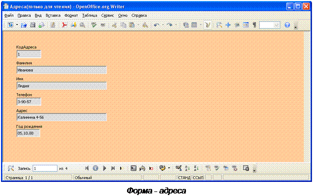 Упражнение 2. Представление записей в форме Каждая запись (то, что являлось отдельной строкой таблицы) теперь представляет из себя как - бы отдельную карточку. Вводить данные удобнее именно в таком режиме. В строке состояния (в нижней части окна формы) отражено общее число записей и номер записи. Перемещаться между записями можно при помощи кнопок: на одну запись вперед, на одну запись назад, к первой записи, к последней записи.