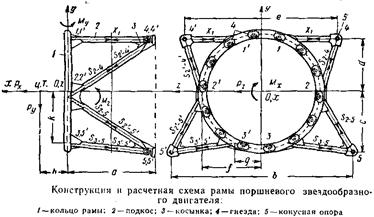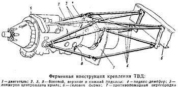 На рисунке показано крепление двигателя к центроплану крыла посредством быстросъемной пространственной двухъярусной фермы и демпферов крепления двигателя к раме. К четырем амортизаторам рамы двигатель прикреплен при помощи двух передних и двух задних цапф. Нагрузку от тяги винта и часть нагрузки от веса двигателя, распределенную по правилу рычага, воспринимают передние амортизаторы. Задние амортизаторы воспринимают только часть веса двигателя. Крепление двигателя состоит из рамы и силовой фермы. Рама состоит из восьми подкосов: шесть выполнены из стальных труб, на концах которых приварены крепежные детали, два задних представляют собой пустотелые стержни со смонтированными на них амортизаторам. Верхние, нижние и задние подкосы имеют на одном конце вилки с резьбовыми наконечниками, служащие для регулировки оси двигателя. Силовая ферма служит для крепления рамы двигателя и силового шпангоута к лонжерону центроплана. Она состоит из восьми подкосов с узлами крепления ее к центроплану и с узлами для крепления силового шпангоута и рамы. Конструкция крепления двигателя ферменно-балочного типа состоит из двух балок б и шести подкосов. Балки могут работать на изгиб от боковых сил. Стержни воспринимают лишь осевые нагрузки. Двигатель крепится на четырех цапфах. Передние цапфы 1вставлены в амортизаторы. При помощи балок и верхних подкосов передние цапфы передают нагрузки на силовой шпангоут гондолы двигателя. Нагрузка от задних цапф передается на силовой шпангоут гондолы посредством подкосов-демпферов. Положение двигателя может изменяться путем регулирования длины внутренних подкосов 6 и задних амортизаторов. Крепление ТРД на летательном аппарате может быть осуществлено при помощи рам, состоящих из стержней, или, если двигатель крепится на пилоне под крылом или в хвостовой части фюзеляжа, — при помощи вильчатых узлов, расположенных сверху на корпусе двигателя. Особенностью крепления ТРД является наличие на самом двигателе силовых поясов. Минимальное количество силовых поясов—два, один из которых является основным. На основном силовом поясе располагаются узлы, воз принимающие нагрузки Рх, Ру и Pz, а также моменты Мх и Му, на дополнительных поясах — узлы, воспринимающие нагрузку Ру и момент У ТРД напряженный температурный режим, вследствие чего его корпус подвержен значительным температурным расширениям. Поэтому двигатель должен быть закреплен так, чтобы компенсировать температурные перемещения корпуса.