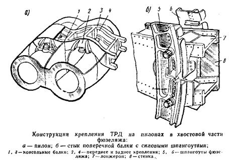 На рисунке справа показано крепление ТРД к силовым шпангоутам фюзеляжа. Особенностью этой схемы является ее асимметрия. Внутри стержневой системы, состоящей из шести основных стержней 3, 4, 5 и 7, 8, 9 и одного дополнительного стержня 6, имеется плоский узел, образованный стержнями 1 и 2. Правильное положение двигателя на самолете достигается регулировкой длины шести основных стержней. Каждый стержень имеет резиновый демпфер для поглощения вибраций во время работы двигателя. Особый интерес представляет крепление ТРД, расположенных на пилонах в хвостовой части фюзеляжа (рисунок ниже). Пилон является силовым промежуточным звеном между двигателем и фюзеляжем. Каждый двигатель крепится в трех точках к штампованным и механически обработанным консольным балкам 1 и 8, присоединяемым по две с каждой стороны фюзеляжа в плоскости переднего и заднего поясов крепления двигателя. Консольные балки двутаврового сечения, выполненные из высокопрочной стали, образуют кессон небольшой высоты. Верхняя и нижняя обшивки этого кессона изготовлены из стали и подкреплены стрингерами. В хвостовой части фюзеляжа имеется два мощных механически обработанных шпангоута 5 и 6, изготовленных из легкого сплава, к котором крепятся поперечные горизонтальные балки, имеющие стальные лонжероны 7 и стенки 8 из алюминиевого сплава. На передней балке установлены узлы, воспринимающие нагрузки Рх, Ру и Plt а также моменты Мх, Му и Mt. Узлы крепления двигателя на задней балке воспринимают силы Ру, Р2, моменты Му и M.z и обеспечивают температурное расширение двигателя. Аналогично выполняется крепление ТРД на пилонах, расположенных под крылом.