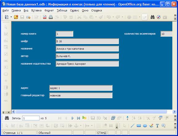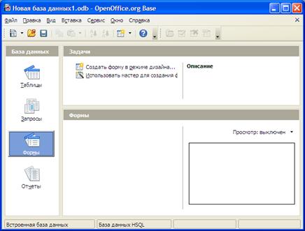 Далее можно создать форму, формы могут создаваться на основе таблиц или на основе запросов. Мы создадим форму, которая будет отображать все данные о книге с возможностью их добавления. Для создания новой формы в OpenOffice.org base можно использовать Мастер форм: 1. Если файл базы данных, в котором нужно создать новую форму, не открыт, то откройте его. 2. В левой области окна базы данных щелкните значок Формы.