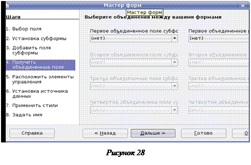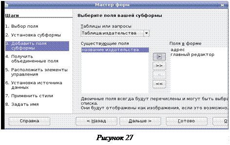 Шаг 3. Выбираем поля для субформы (это будут поля «адрес» и «главный редактор» таблицы «издательства») (Рисунок 27).