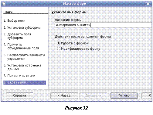 Шаг 8. На заключительном шаге задаем имя формы как «информация о книгах» и отмечает, что после заполнения формы хотим с ней работать (Рисунок 32).
