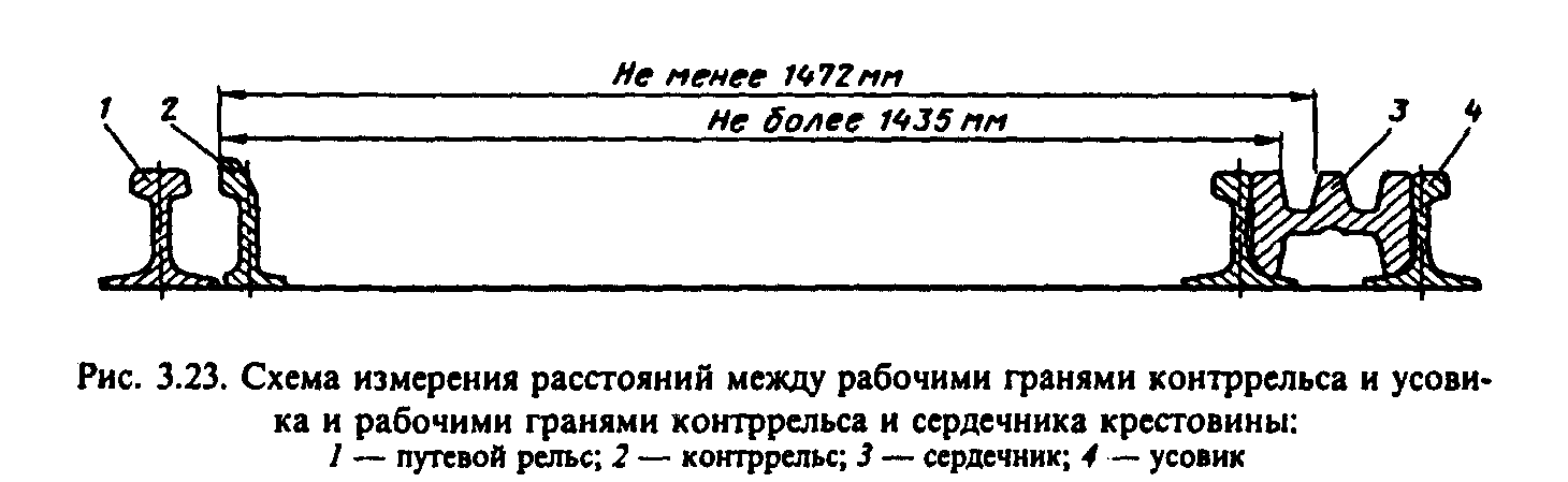 Рис. 28. Схема измерения расстояний между рабочими гранями контррельса и усовика и рабочими гранями контррельса и сердечника крестовины (1 - путевой рельс, 2 - контррельс, 3 - сердечник, 4 - усовик)