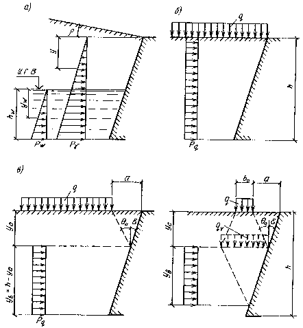 Рис. 5. Схема давления грунта а - от собственного веса и давления воды; б - от сплошной равномерно распределенной нагрузки; в - от фиксированной нагрузки; г - от полосовой нагрузки