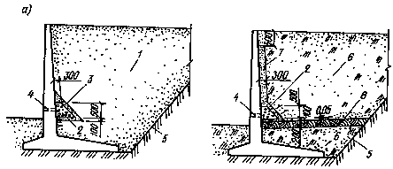 Рис. 25. Типы наружных стен подвалов а - из монолитного бетона; б - из вертикальных стеновых панелей; в - из горизонтальных стеновых панелей