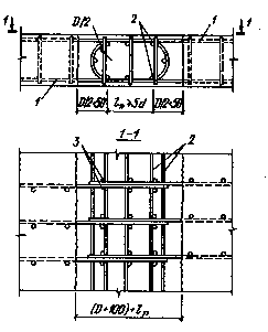 Рис. 24. Установка дополнительных поперечных стержней в зоне петлевого стыка 1 - сопрягаемые железобетонные элементы; 2 - продольные стержни в бетонном ядре; 3 - дополнительные поперечные стержни