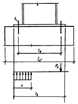 Черт. 23. Расчетная схема для определения усилий в анкерных болтах стальной колонны сплошного тина Расчетное усилие Р в анкерном болте рекомендуется определять по формуле P = (Rb bb x - N) / n, (88) где Rb - расчетное сопротивление бетона осевому сжатию с учетом коэффициентов gb2, gb3, gb9; bb - ширина опорной плиты базы колонны; N - продольная сила в колонне; n - число растянутых болтов, расположенных с одной стороны базы колонны; х - высота сжатой зоны бетона под опорной плитой базы колонны, определяемая по формуле х = 0,5 (la + lb) - где la - расстояние между анкерами (см. черт. 23); lb, bb - соответственно длина и ширина опорной плиты;