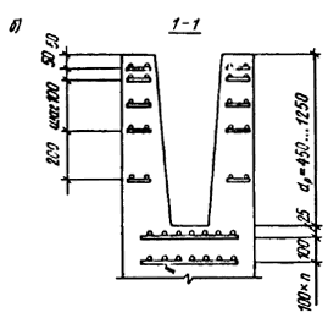 Черт. 30. Армирование бетонного подколонника, имеющего стакан 4.23. Если в сечении бетонного подколонника возникают растягивающие или сжимающие напряжения менее 10 кгс/см2, то при максимальных сжимающих напряжениях более 0,8Rb (напряжения определяются как для упругого тела) необходимо выполнять конструктивное армирование на всю высоту подколонника. При этом площадь сечения арматуры с каждой стороны подколонника должна быть не менее 0,02% площади его поперечного сечения, а в случае расположения арматуры по периметру сечения — не менее 0,04 %. 4.24. При расчетном или конструктивном армировании подколонника диаметр продольных стержней вертикальной арматуры принимается не менее 12 мм. В бетонном подколоннике минимальный диаметр продольной арматуры принимается равным 10 мм. 4.25. Горизонтальное армирование стаканной части подколонника осуществляется сварными плоскими сетками с расположением стержней у наружных и внутренних поверхностей стенок стакана. Продольная вертикальная арматура должна размещаться внутри горизонтальных сеток. Диаметр стержней сеток принимается не менее 8 мм и не менее четверти диаметра продольной арматуры вертикального армирования подколонника. 4.26. Расположение горизонтальных сеток следует принимать по черт. 31.