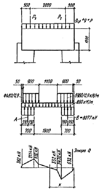 Обозначения, принятые в таблице: g - постоянная равномерно распределенная нагрузка от перекрытия подвала; g1 - собственный вес оголовка; р - временная нагрузка от перекрытия; G1, Р1 - постоянная и временная нагрузки от перекрытия; G2 - собственный вес стойки подколонника; P2, P3 - усилия от ветвей стальной колонны. Силы P2 и Р3 действуют одновременно. Класс бетона по прочности на сжатие В25; Rb = 14,5 МПа (148 кгс/м2); Pbt = 1,05 MПа (10,7 кгс/см2). Eb = 27 × 103 МПа (275 • 103 кгс/см2), gb2 = 1,1. Коэффициент надежности по назначению принимаем равным 1. В результате статического расчета на ЭВМ получены усилия в стойках и промежуточном ригеле подколонника. Подбор сечения арматуры в стойках подколонника осуществлен с помощью ЭВМ. Расчет оголовка подколонника произведен для свободно опертого элемента. Схема нагрузки, расчетная схема и эпюра перерезывающих сил приведены на черт. 38.