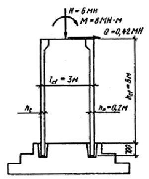 По формуле (104) СНиП 2.03.01-84 при jb = 1,17 < 3,5: Rb,red = Rb jb + j mxy Rs,xy js = 14,5 × 1,17 + 3,47 × 0,0579 × 225 × 1 = Rb,red Aloc1 = 21,8 × 0,1 = 2,18 МН (220 тс) > N = 1,88 МН (192 тс). Прочность сечения обеспечена. Пример 4. Расчет сборно-монолитного железобетонного фундамента стальной колонны Дано: фундамент с монолитной плитной частью и сборно-монолитным подколонником высотой hcf = 6,0 м, размерами в плане bcf = 1,5 м, lcf = 3,0 м. Сборные элементы подколонника в виде плоских плит t = 0,2 м (черт. 39).